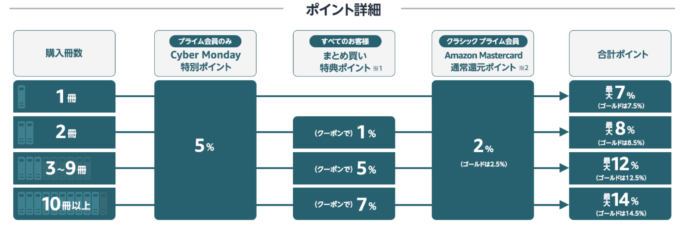 まとめ買いをすることで、最大14%のポイントをもらうことができるよう。紙の本で欲しい物がある方は要チェックです。