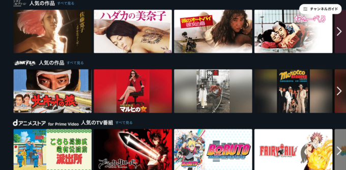 課金することでこのようなチャンネルに入ることができる。プライムビデオにこういったチャンネルを組み合わせることによって、見れる日本映画の量が桁違いになります。角川とか東映、松竹が専門にやってるチャンネルを拡張することで、角川映画や松竹映画が見放題になったりします。