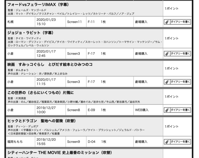 という特典がついてくる。おそらく日本で最も発行されているTOHOのシネマイレージカードよりも僕はコスパがいいと思っている。そして鑑賞履歴も見ることができ、シネマイレージよりも見やすい。