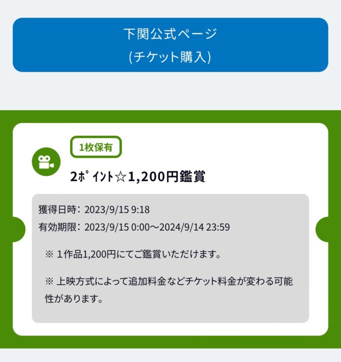 2ポイントで発券すると、よく使う劇場の設定をしている劇場でしか使えない券が発券されるというシステムのため、当時なんとなく登録していた下関でしか使えないものがでてきて困った。そのため非常に厄介だと思っていたのだが、マイシアターの設定を変更すると、飯塚で使えるものになっていた。