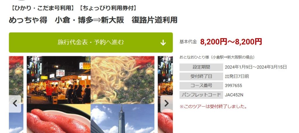 近畿日本ツーリストのめっちゃ得プラン:博多~新大阪 → 11,800円