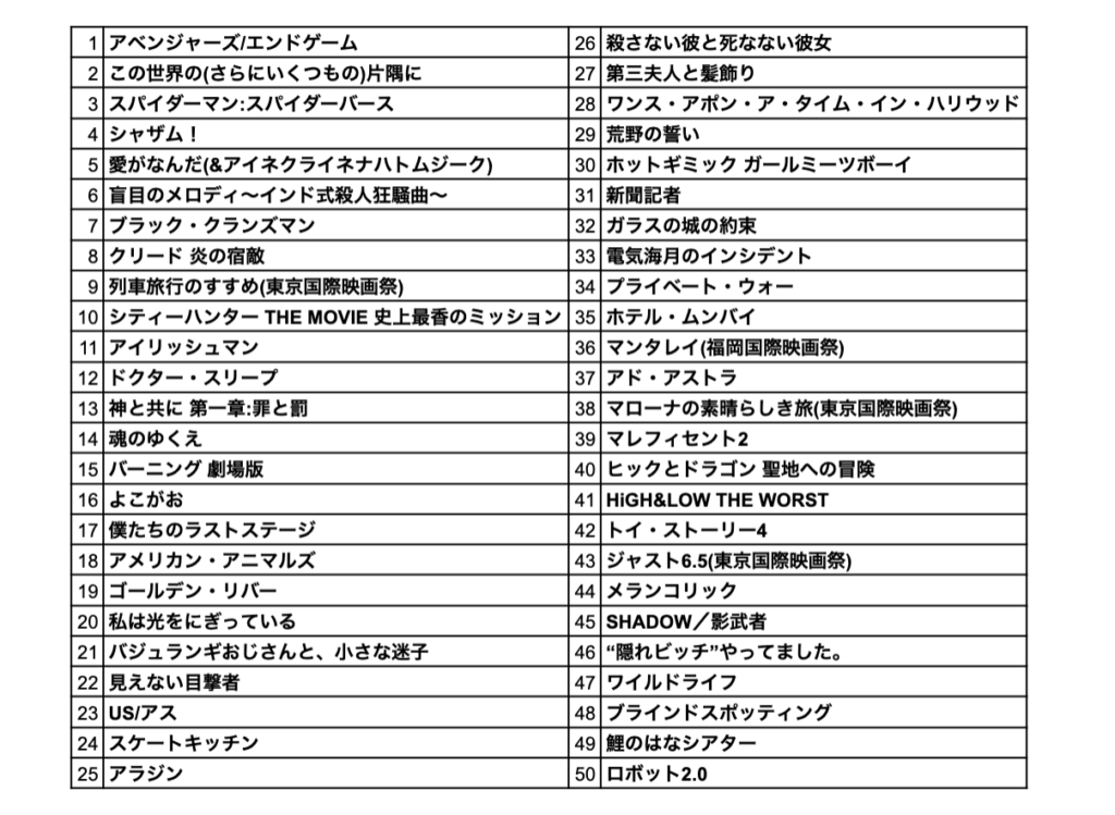正直言って、『アベンジャーズ/エンドゲーム』『スパイダーマン:スパイダーバース』は別格な感があるので除外してランキングを作りたかったけど、『この世界の(さらにいくつもの)片隅に』『シャザム!』が1位と2位なのはちょっとあれだろうと思って結局入れた。