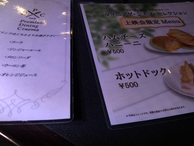 プレミアム・ダイニング・シネマで食べられるメニューは株式会社ロイヤルが提供している。つまりはロイヤルホストと同じような食事ができるということだ。食事メニュー、ドリンクメニューは250円とか500円、1000円みたいにあまり小銭を使わずに済むような値段設計。ロイヤルホストと同じくらいか、若干高いかくらいの料金の食事ができる。