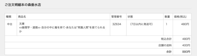 上のスクリーンショットの上部、480円の中古の本を購入したいと思った時、選んで購入すれば、取り扱っている「本の森垂水店」から配送してくれるというそんなシステム。