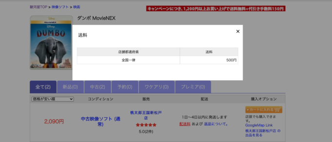 金額に関わらず全国一律500円とかのところもあるので、出品している店の送料はチェックしておきましょう。